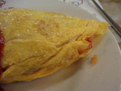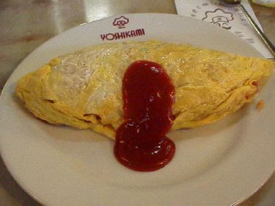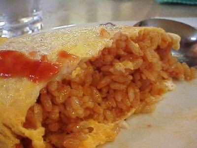 - 中身は、ハムとタマネギとグリーンピースとマッシュルームが入ったケチャップ炒めご飯。ご飯を包む卵焼きは、わりとしっかり焼いてあるタイプです。ごく普通に家庭でも作るタイプのオムライスです。中身のケチャップご飯の独特の甘味が、家で素人が作るのとちょっと違うところかな。(び)