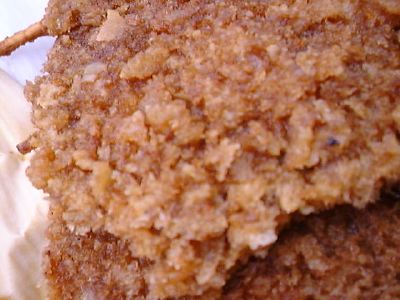 - 仕込みが凄い。6:30ぐらいから14:30ぐらいまで、レバーを柵に切って、血管を包丁の先で、一本一本丁寧に取り除く。なので、まったく血まなぐさくなく、非常においしい。生後8ヵ月の赤ちゃんが、丸のみしても消化不良をおこさないというのも、凄い。薄く伸ばしたレバーに、パン粉を漬け、揚げたあと、ウスターソースに浸す。下町の味とでもいうのか、いいですよ、こういうのは。食べていてすがすがしいというか、それまでちょっとお腹がふくれていた感じが、食べたおかげで空いてきました。(な)