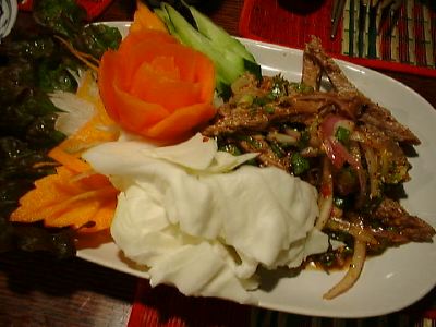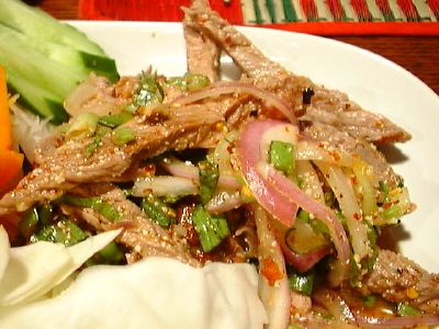 - こうの手のスパイシーで香ばしい焼肉系は、タイ料理の中でも個人的にかなり好きな物です。飾りの野菜と肉のバランスがちょっと悪いかな。もう少し肉多めだと嬉しい。(び)