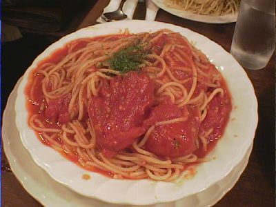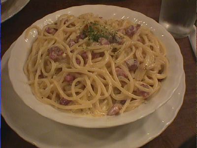 - かぜ気味のふたり(jin&yuko)は、こってり系はちょっと控えたいということで、カルボナーラは普通盛にしました。なんだか妙にお皿が小さく見えた。味は、ソースの粘度といい塩加減といい、とてもいい具合でした。満足です。(び)