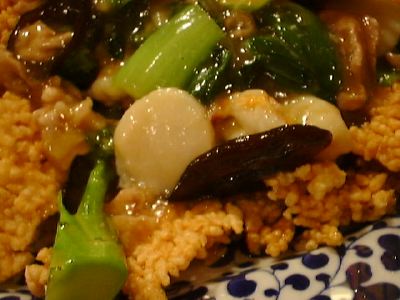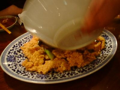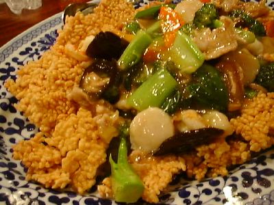 おこげが、揚げせんべいっぽい味でした。おこげはサクサクです。おこげ自体に味があるぶん、かける具の方がわりと薄めの味付けでしたね。これを食べていて思ったのだけど、歌舞伎揚げとかに薄味の野菜炒めにとろみをつけたものをかけたら美味しいかも。(び)