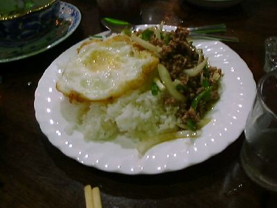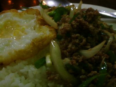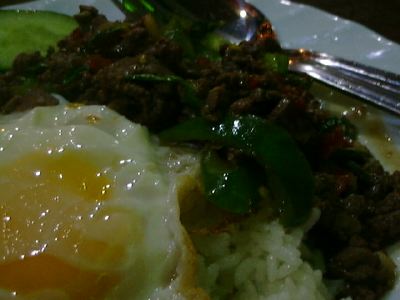 - ピーマンと肉を炒めたものと目玉焼きがご飯の上にのっているものです。全部混ぜて食べます。これはなかなか美味しい。おすすめ。(び)