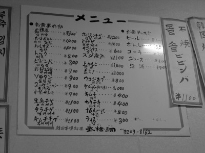 - マッコリはメニューにないので値段がわからなかったけど、韓国では安い酒としてよく飲まれているものなので、たいがいの韓国料理屋では頼めば出てくると思います。少し甘くて少しすっぱい発泡酒で、口当たりもよく飲みやすいです。(め)
