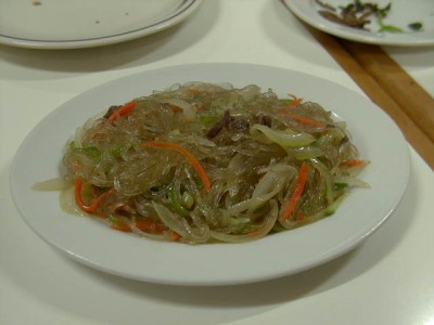 - 最近気に入ってるメニューで、韓国料理屋などで見つけると頼むようにしています。ゴマ油と春雨で作った焼きソバみたいな感じ。韓国料理に使う春雨はモチッとしていて腰が強く、シャブシャブに入れる葛切りに近いものです。(め)