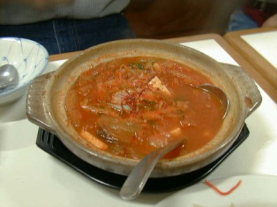- 豆腐とキムチがたっぷり入ったチゲ鍋です。酸っぱいのはキムチがよく漬かってるものだからですね。辛さの中にうまみがたっぷりで美味しかったです。(め)