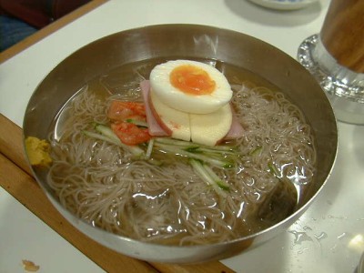 - うん、こういうふうに高く盛りつけられてる冷麺をよく混ぜて食うってのは今まで全然知らなかった。確かに混ぜて具と麺を一緒に食べるのはいいですね。(め)