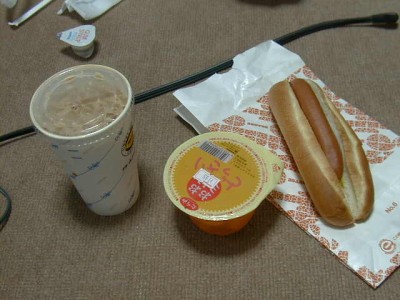 マシンルームから来たitojunの夕食。ドトールのジャーマンドッグとアイスカフェラテ(L)、それからゼリー。計650円。