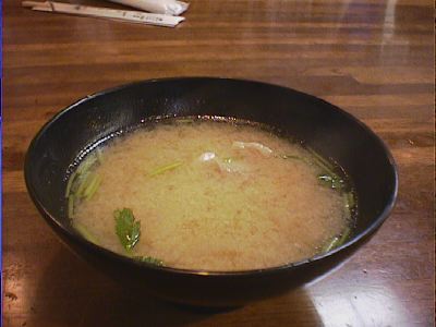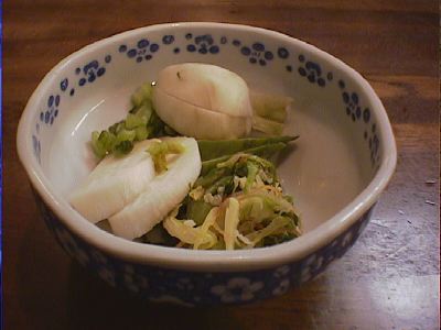- 定食につくライス、ぶた汁、サラダ、おしんこ。