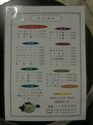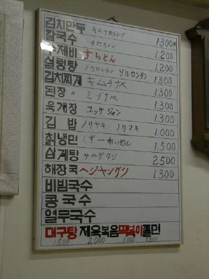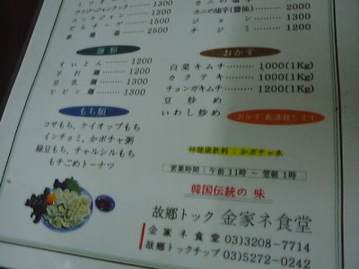 穀物を炒ったような、ココナッツジュース(ミルクじゃないほうの)の香ばしさのよ うな香りがしますね。飲み物はメニューがなく、冷蔵庫にアサヒドライが見えたくら いでした。「マッコリありますか?」って聞いたら、「置いてないけど、飲みたかっ たら買ってきてあげる」とのことでした。遠慮しておいたけど、もし頼んだら隣の武 橋洞あたりから買ってきたりして(笑)(め)