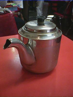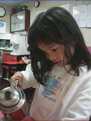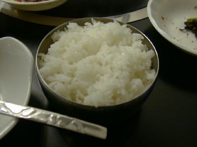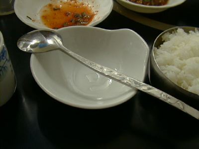 茶わんが金属なので手に持つと熱いです。でも、韓国では茶わんは手でもたずに、ス プーンですくって食べる(箸はおかずを食べるのに使う)のが作法なので、器が熱く てもよいのですね。(め)