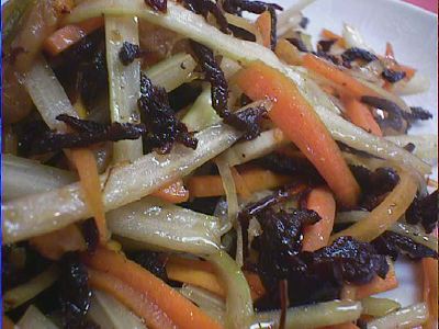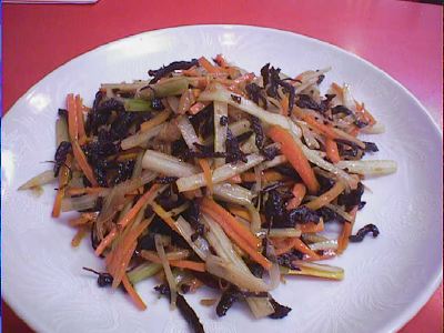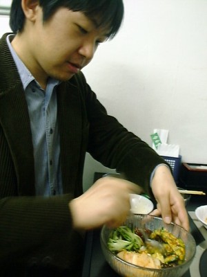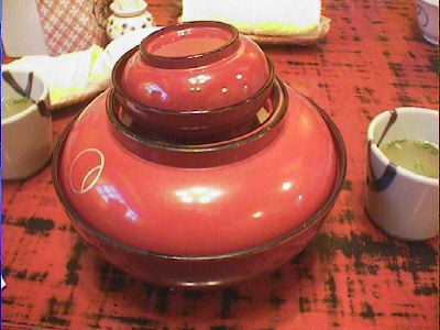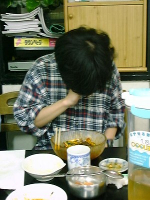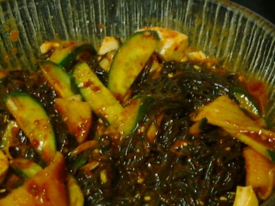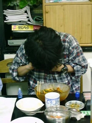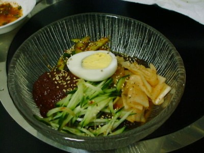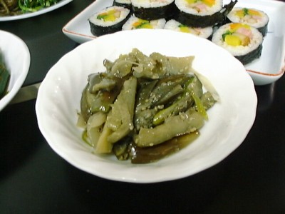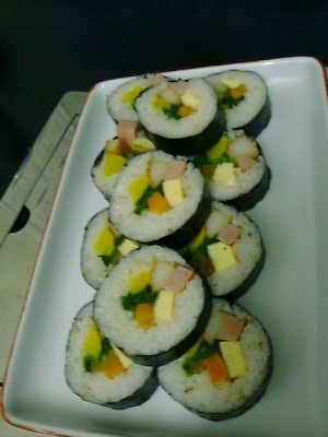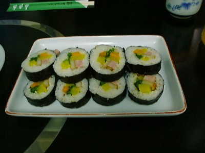 金家ネの名物料理。韓国風といっても韓国ノリ(味がついてるやつ)ではなく、普通 のごはんと普通のノリで具を太巻きにしたもの。具もたくあん、煮たニンジンをゴマ 油で炒めたもの、卵焼きなどで、やさしい味。美味しかった。(め)