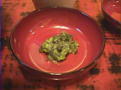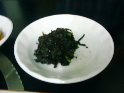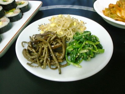 ナムルも頼もうと思ったけどメニューにないなぁと思っていたらサービスしてくれま した。先週の武橋洞で食べたものと同じく、豆モヤシ、ぜんまい、ほうれん草の3点 セットでした。個人的には大根のナマスみたいのも入ってると嬉しい。(め)