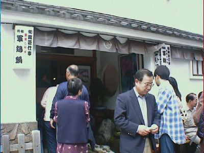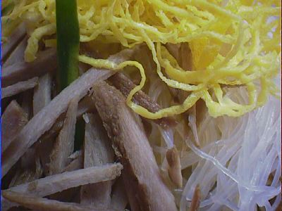 麺は葛をねりこんであるそうです(であってるのかな?)。 非常に細麺でからみあっているので、とりわけるのに非常に苦労します。(い)