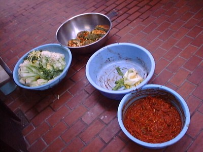 お店の前で今まさに漬け込まれようとしているキムチ。漬け込みの旬っていつなのかな?(い)