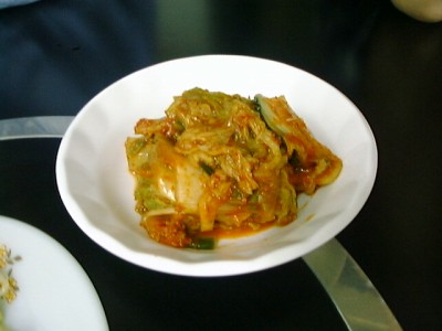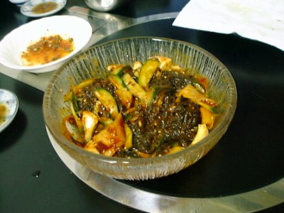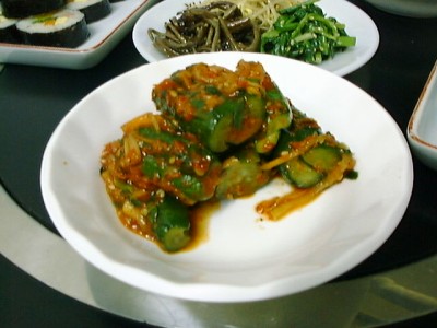 白菜キムチはよく漬かってます。オイキムチは辛くないものをよく食べるけど、ここ のは唐辛子使ったもの。茄子は甘く、やわらかくて、まったく辛くありません。おい しー。アサリのキムチは少し生臭いですね。(め)