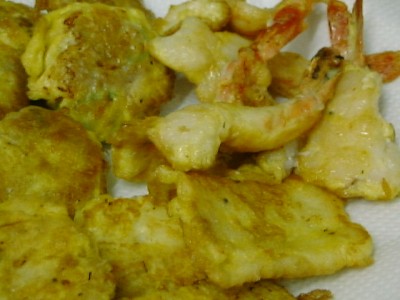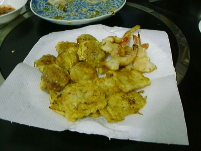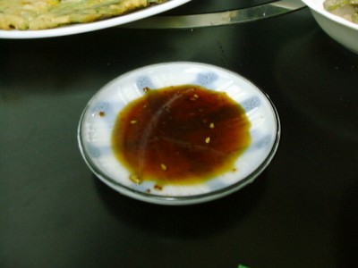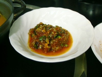 これも、やっぱりチジミのタレで食べてねと言われました。 3種類で白身魚、ひきにく、それから海老。3種の中ではひきにくが好きかな。(い)