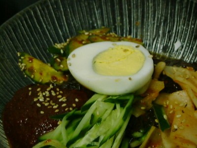 「この麺はどうしてこんなに色がついているの?」って聞いたら「 くずを使ってる」と答えてくれました。普通冷麺の麺はそば粉やデ ンプン、小麦粉を混ぜて作るらしいけど、ここのはくず粉が入った 麺らしいです。麺についてる色の説明にはなってないです(笑)