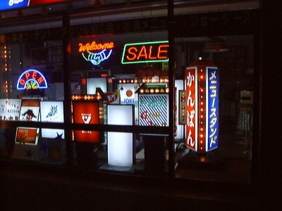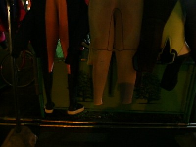JIN-NETマシンルームへの途中にあった、干されているウェットスーツと看板屋。看板屋はシュールでなかなかよい。(い)