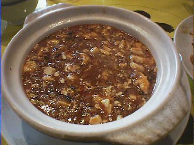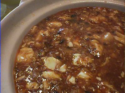 - 土鍋のような深い器に入った麻婆豆腐というのは初めてだよ。確かに、こうしてみると煮込み料理だね。濃いスープという感じで食べられていい。特に、ご飯にかけて食べたりするのにはいい具合だった。
