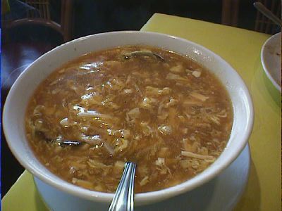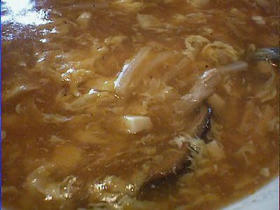 - このスープは、酢のすっぱみと、コショウの辛みが特徴であるが、それがよくでていたと思う。スープの中には、椎茸、豆腐少々、玉子等がはいっていて、すっぱくて辛いながらも、まろやかさがある。若干コショウが足りないと思う人は、テーブルのコショウを少々ふってやるといい。(な)