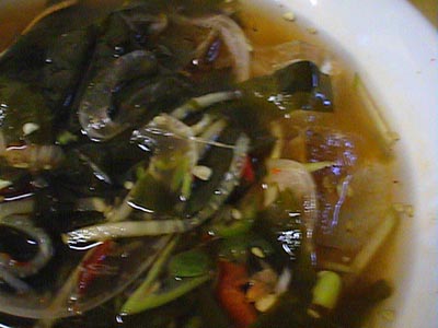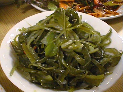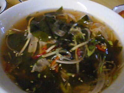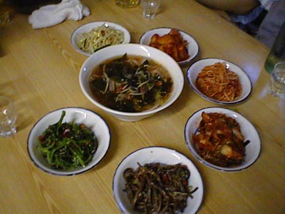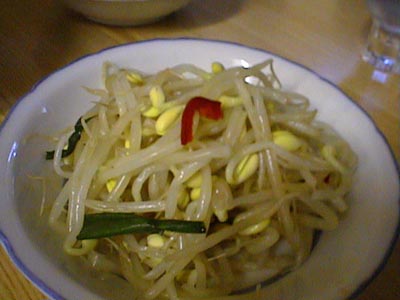 - うん、空豆のモヤシで作ったナムルは初めて食べたけど、空豆の味がして面白かったね。白菜キムチとカクテキ、カブのキムチ(細切りになってるやつ)はかなり辛いです。ワカメ(メカブっていうのかな。桂花ラーメンに入ってるアレ)のナムルはめずらしくてよかった。さつま揚げのような練り物を野菜とゴマ油で和えたナムルも初めて食べました(味はまんまさつま揚げの味)。スープのようなやつはワカメとキュウリの冷やしスープで、韓国では最もポピュラーなスープらしいです。さわやかで美味しいです。これだけのものをサービスで出してくれるとは本当にありがたいことです。(め)