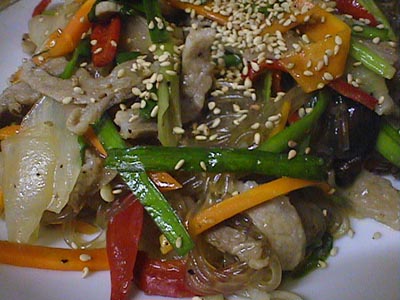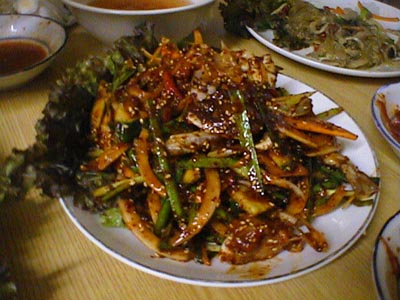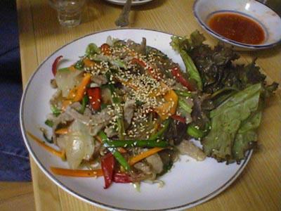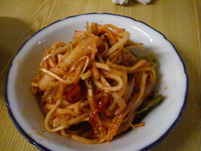 - 春雨炒め。韓国の春雨はさつまいも澱粉から作るもので、モチモチとしてるところがいいんだけど、ここのチャプチェはコシが少なくて、自己主張の少ない春雨を使ってますが、これはこれで美味しいです。チェプチェって店によってずいぶん味が違うのが面白いですね。この店のは野菜タップリでまさにオモニの味です。(め)