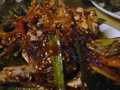- ケジャンは生のワタリガニを甘辛いミソダレに漬け込んだものです。これもまた野菜タップリでサラダ感覚で食べられるほどです。焼き肉屋で食べる、どちらかというと辛さを楽しむ感じのケジャンとは違って、しっかり家庭料理になってるなぁ〜という感じ。ケジャン好きなkumaちゃんの評価はどうかな?(め)