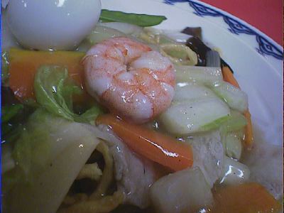良くも悪くも普通の五目そば。スープは鶏のうまみがあまりなく、化学調味料の助けを借りてるのがわかる味(舌がピリピリするほどではないので許容範囲だけど)。これも別に一人で抱えて食べたくはないかな。(め)