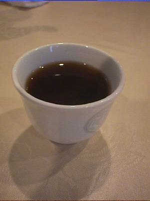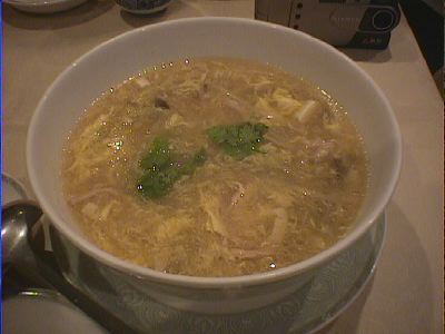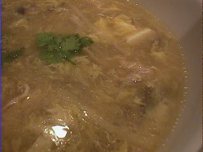 こしょう、酢が利いているのが特徴のスープ。しいたけをもう少しいれると香りがさらにひきたつだろう。すっぱく、辛く、卵のまろやかさがある。(な)