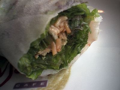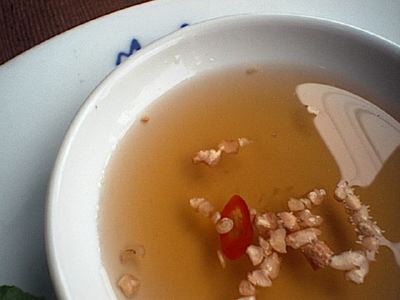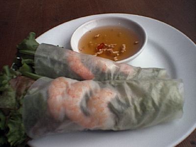 エビ、豚肉、そうめん、サニーレタス、大葉、ミント、ニラをライスペーパーで巻いてあります。小さな丸いライスペーパーでくるりとひとまきしただけの生春巻で、たっぷりのレタスがはみだしています。タレはナムプラーが強めだけど、味はよかった。ミントの香りが爽やかで、サラダ感覚の生春巻です。