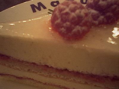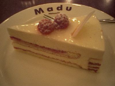 上に乗ってる木イチゴが懐かしい味。むかし野原に生えてるイチゴを摘んで食べたときの、「あ、すっぱくてちょっと美味しいけど、やっぱクセがあるから普通のイチゴのほうがいいな」と思った感じがよみがえってきます。ケーキ地をはさんでるのはチーズクリームのようなムースなんだけど、後味がちょっとマヨネーズっぽい感じ。なんて書くとまずかったみたいだけど、美味しかったですよ。