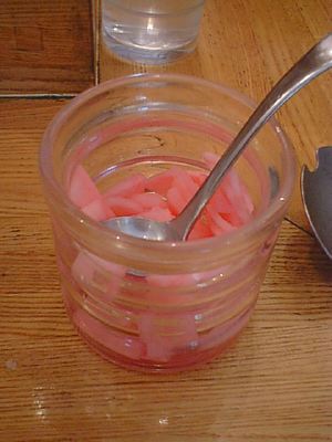 このピンクの大根とタマネギの漬物、ライスたくさんにのせて食べるといいですね。アジャンタでアチャールをたっぷりのせて食べるような感覚で。(び)