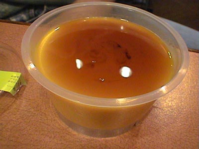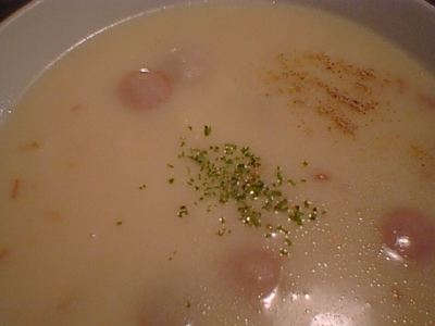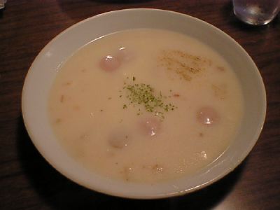 給食に出てきたような、甘くてやさしい味のホワイトシチューですね。具はタマネギと輪切りにしたソーセージ。このソーセージがまたいい味を出してます。実は、僕はシチューの具(角切りの肉やジャガイモやニンジン)があまり好きじゃないので、このホワイトシチューはとても嬉しいです。ホットドッグとの相性もいいですね。(め)