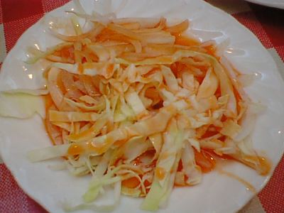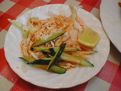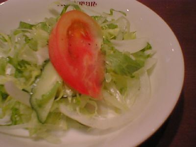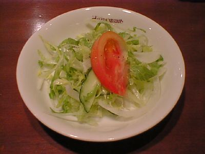 - 最初に出てくるサラダです。トマトとキュウリとキャベツとタマネギが入っていたかな。(び)