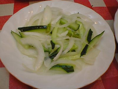 - タマネギ、キュウリ、ブリッキーヌを酢であえたものが付いてきて、ご飯にのっけて食べました。(を)
