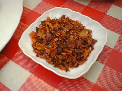 - このふりかけがかなり気に入りました。焦がしたタマネギ、干しエビ、唐辛子などが入っていて、ついつい食べてしまう。(び)