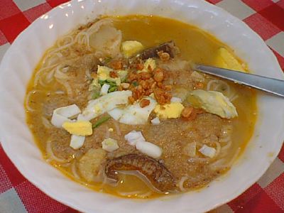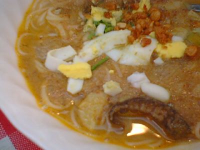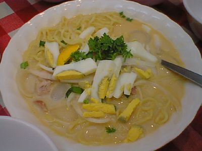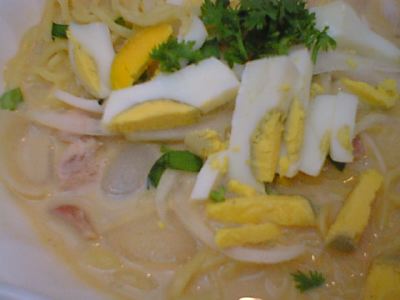 - ココナッツミルク味のラーメンと思えばほぼあたりです。パクチーがのっています。(び)