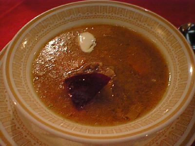 ボルシチというのはビーツ(赤かぶ)をすりつぶして全体に混ざってるものだと思うけど、これは薄切りの酢漬け(酢酸の匂いがきつい)ビーツが一切れ浮かんでいるだけです。こうしたほうがスープ自体は美味しいかもしれないけど、少し残念な感じ。(め)