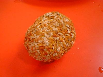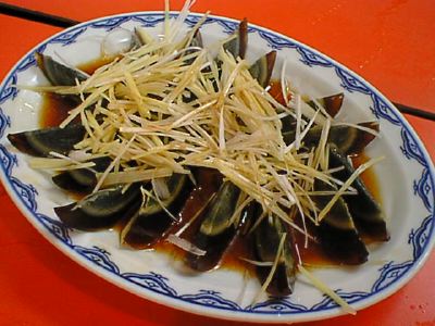 皮をむく前のピータンを見せてもらったら、よく中華食材店などで見かけるピータンとはだいぶ外見が違っていました。これは日本製のピータンで、最近は日本製のもののほうが品質が良いんだそうです。(め)