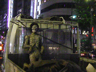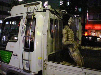 博多天神の前でトラックの荷台にくくりつけられた死体を発見。