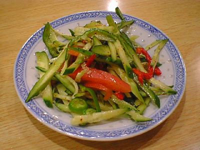 - サラダです。ハムサイといっても、ハムが入っているわけではありません。キュウリとトマトとピーマンにスパイスをまぶしたという感じかな。(び)
