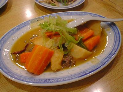 - ほんと、羊肉の肉ジャガみたいですね。この色は何でついてるんでしょうね。ちょっと変わった感じの唐辛子も入ってたし。野菜の煮えぐあいもよくて美味しかったです。(め)