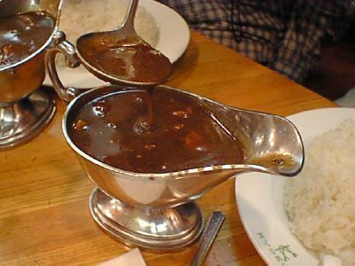 - コクと苦味が独特で不思議な感じがします。確かにこのルーは未体験の味でした。とろみがかなりはげしくついています。肉は角切りのやつがどかどかっと入っています。やわらかいので文句ないです。(を)