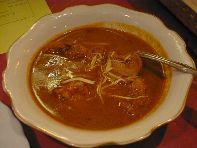 - これにも刻んだ生姜がのっています。肉はやわらかくて、くさみもないし美味しい。チキンカレーと同様、これも胡椒がきいています。辛さはチキンカレーと同じくらいです。あまり辛くはありません。ルーのとろみの具合は、チキンカレーとほぼ同じです。(び)