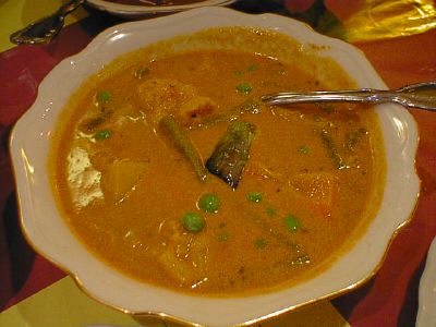 - ジャガイモ、ニンジン、ナス、インゲン、グリーンピースが入っています。辛さはありません。