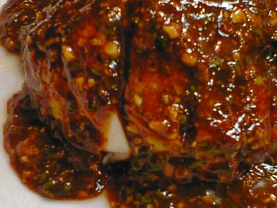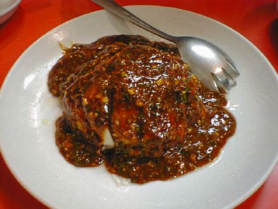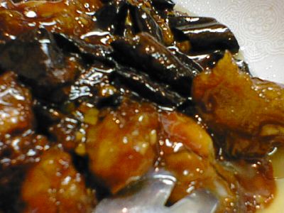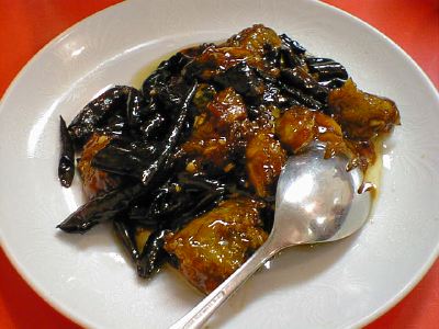 - レバーのときと同じように衣をつけてある。カキ自体の味はそれほど感じられないのだが、甘み餡、カラメルが、よくマッチしている。カキのやわらかい食感もこたえられない。あいかわらず大きめの唐辛子の味、香りがとてもよい。(な)
