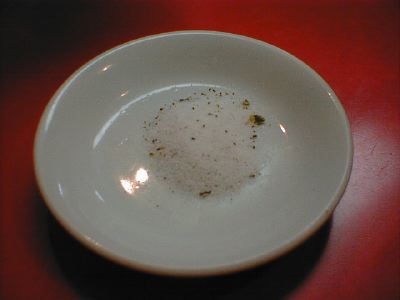 - 鍋[米巴]を椒塩につけて食べる。本当は麻婆麺を頼んで、それにつけて食べようとおもっていたが、あとででてくるフカヒレソバを特別に作ってもらったので、鍋[米巴]はそのまま食べることになった(白果蝦仁の餡をかけても結構いけます)。カリカリの鍋[米巴]は、そのまま食べても結構いける。これに蝦チリを、上からかけたものは蝦仁鍋[米巴]という。(な)