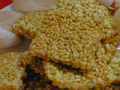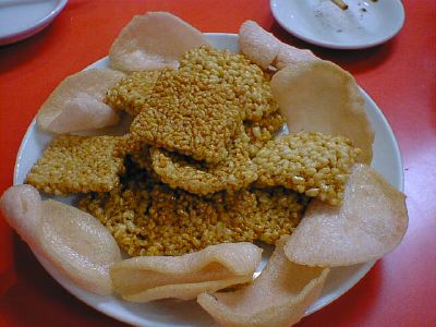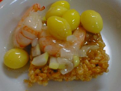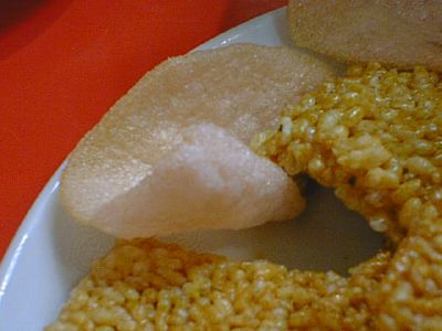 - 揚げたて熱々。慌てて食べると火傷するよ。白果蝦仁やフカヒレそばをかけて食べると、これがまた美味。エビ煎餅はサービス。(び)