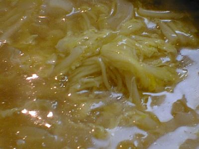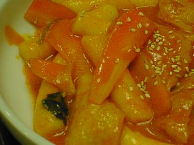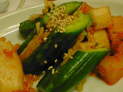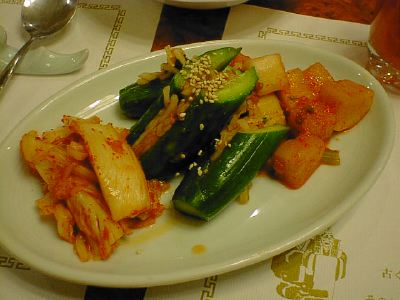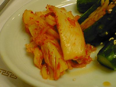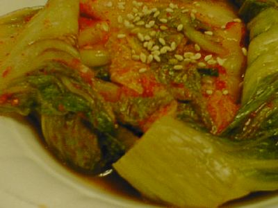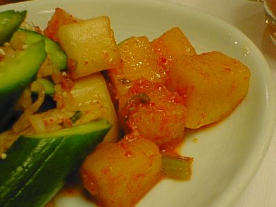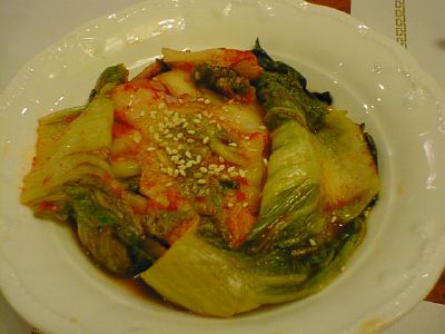 - キムチの王様ってやつですね。白菜の外側の緑色の葉っぱでいろいろな具を包んで漬け込んであります。タコがいっぱい入ってました。もっと複雑な味を期待したけど、キムチとしての味は普通だったのがちょっと不満。(め)