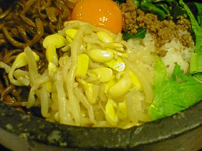 - ビビンバにコチジャンを入れるとき、味を確かめずにたくさん入れると辛さより塩辛さで味が壊れちゃうことがあるけど、ここのコチジャンは辛さも塩分も薄いので、たっぷりめに入れるといいですね。ビビンバとしての味はとてもよいけど、おこげができるほど焼けなかったので、もう少し器に熱容量があると嬉しかった。(め)